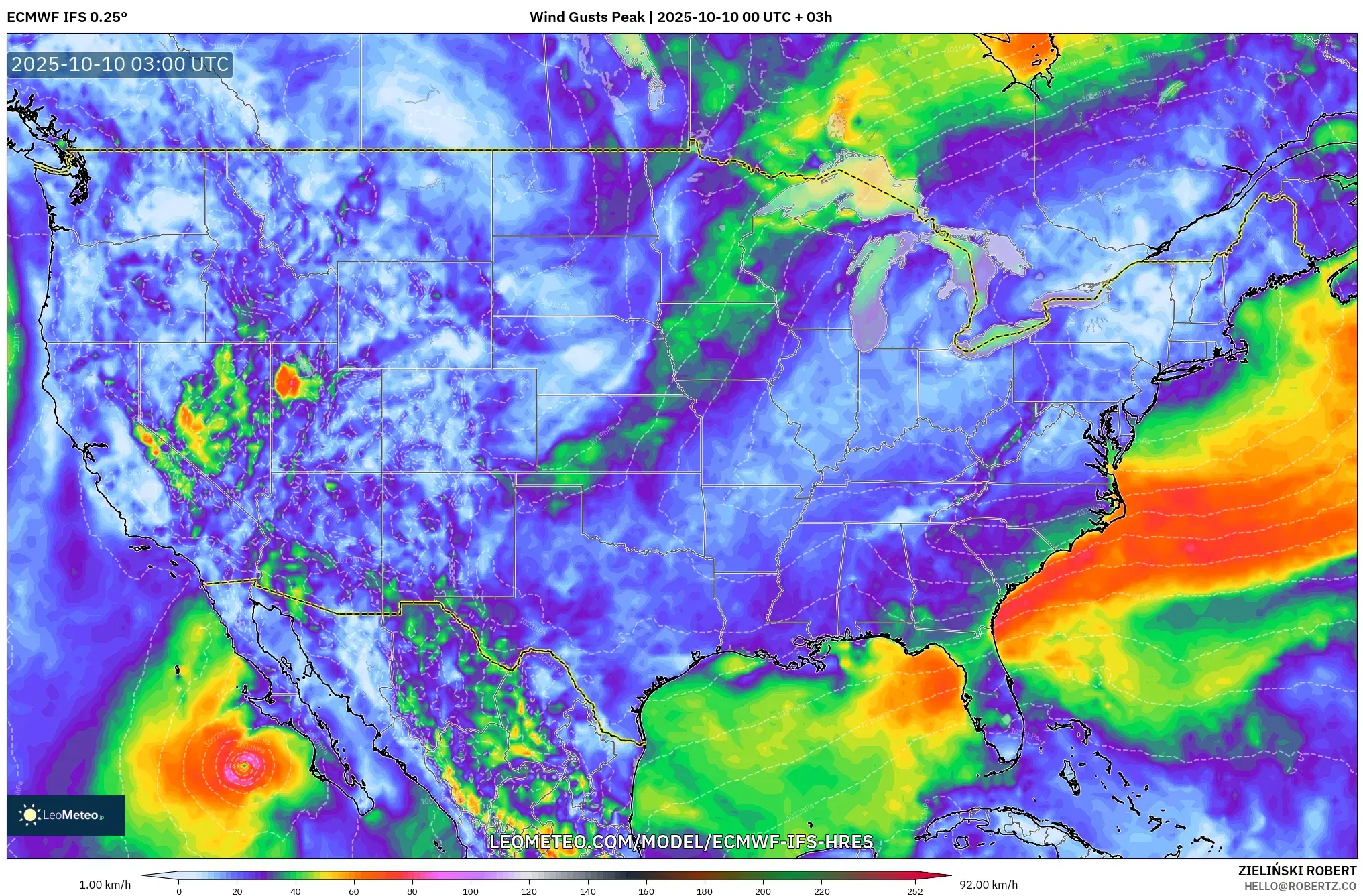 ECMWF IFS 0.25° model - United States, Wind Gusts Peak